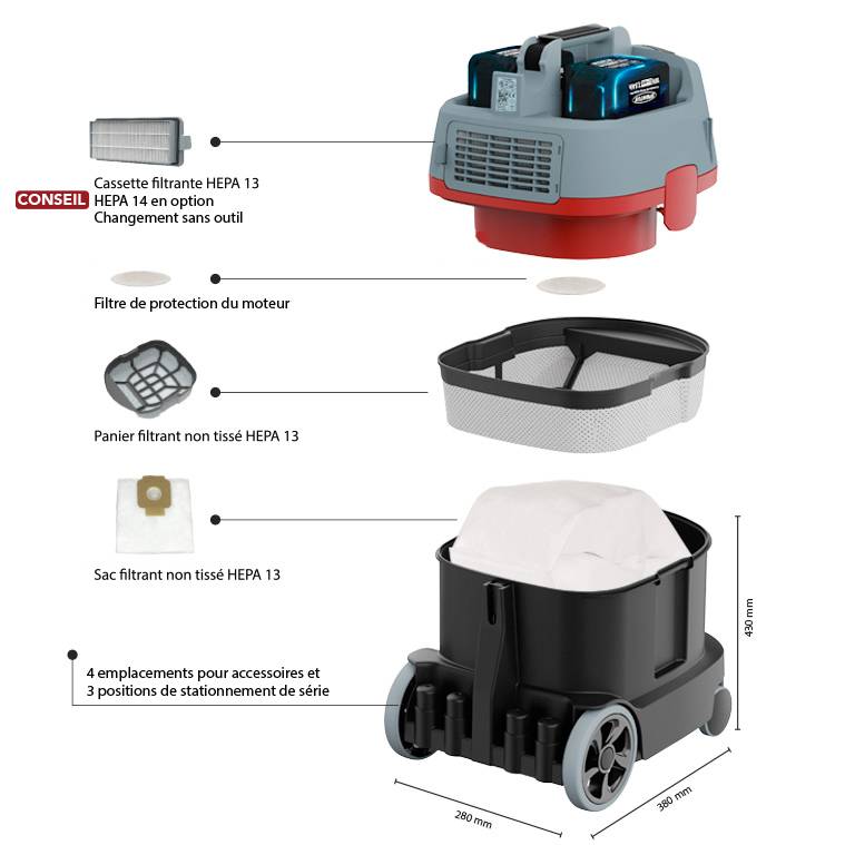 L'aspirateur à sec à batterie innovant ERA iGO garantit un maximum de flexibilité et de mobilité. La version 36 V Li-Ion combine un travail sans fil et autonome avec les caractéristiques uniques de la série de modèles ERA. Équipé de deux batteries de 18 volts et d'un moteur EC de 300 watts, l'ERA iGO vous permet d'obtenir un excellent résultat de nettoyage. Les batteries montées en série garantissent un travail autonome jusqu'à 90 minutes, tandis que le double chargeur rapide assure un temps de charge de la batterie d'environ une heure. Vous réglez la puissance en continu directement sur l'appareil, de 150 à 300 watts. Ainsi, la puissance d'aspiration peut être adaptée à tout moment et sans problème au revêtement de sol correspondant.