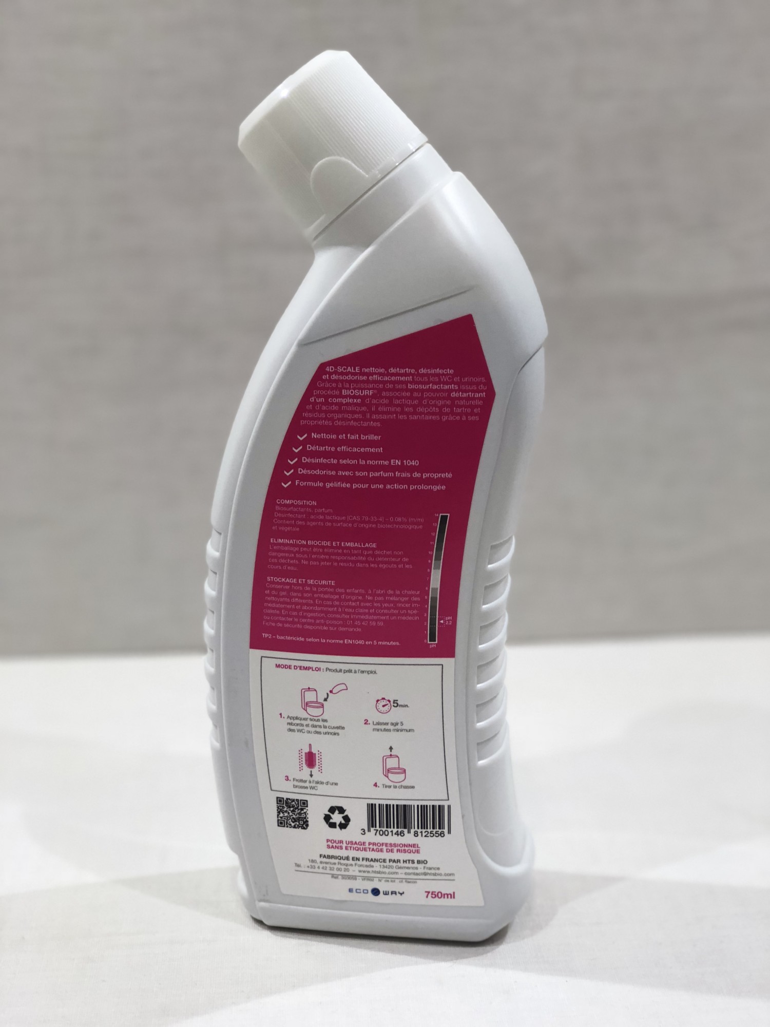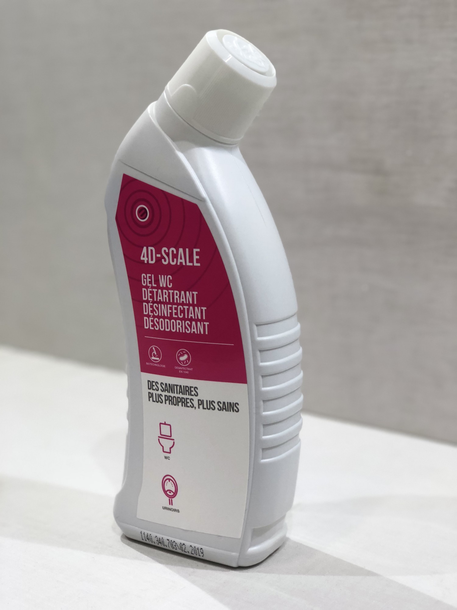 4D Scale désinfecte (EN 1040) et détartre efficacement vos WC grâce à son complexe unique d’acide lactique d’origine naturelle et d’acide malique associé aux biosurfactants.